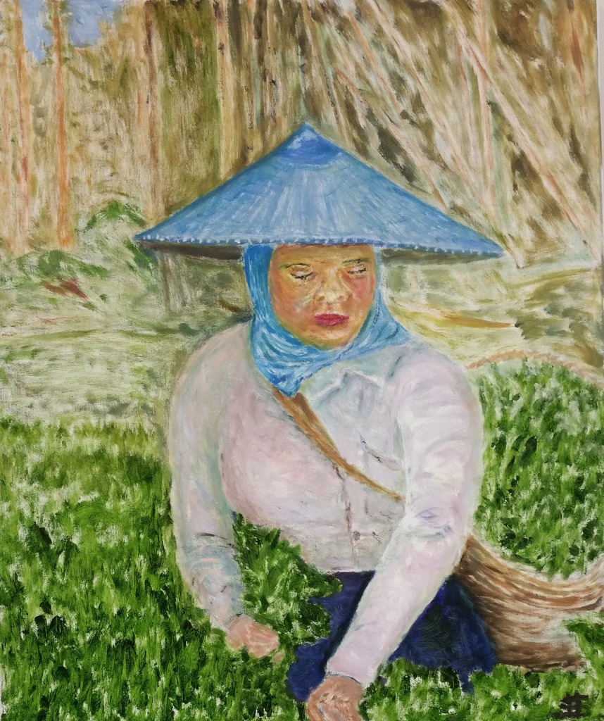 Een theeplukster, die de theebladeren uitzoekt en in haar mand bewaard (Sumatra 2005) Olieverf op doek.