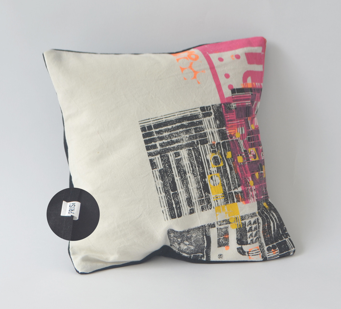 Lego druk, patronen over elkaar heen in verschillende lagen en kleuren. Achterkant met envelop sluiting kleur effen zwart. Kussen kan gewassen worden op 30 graden.