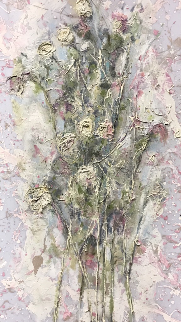 Groot, figuratief werk waarin mensen (en soms dieren) centraal staan. Door uitsnede, materiaalgebruik en een sober palet ontstaan confronterende beelden die uitnodigen tot reflectie.