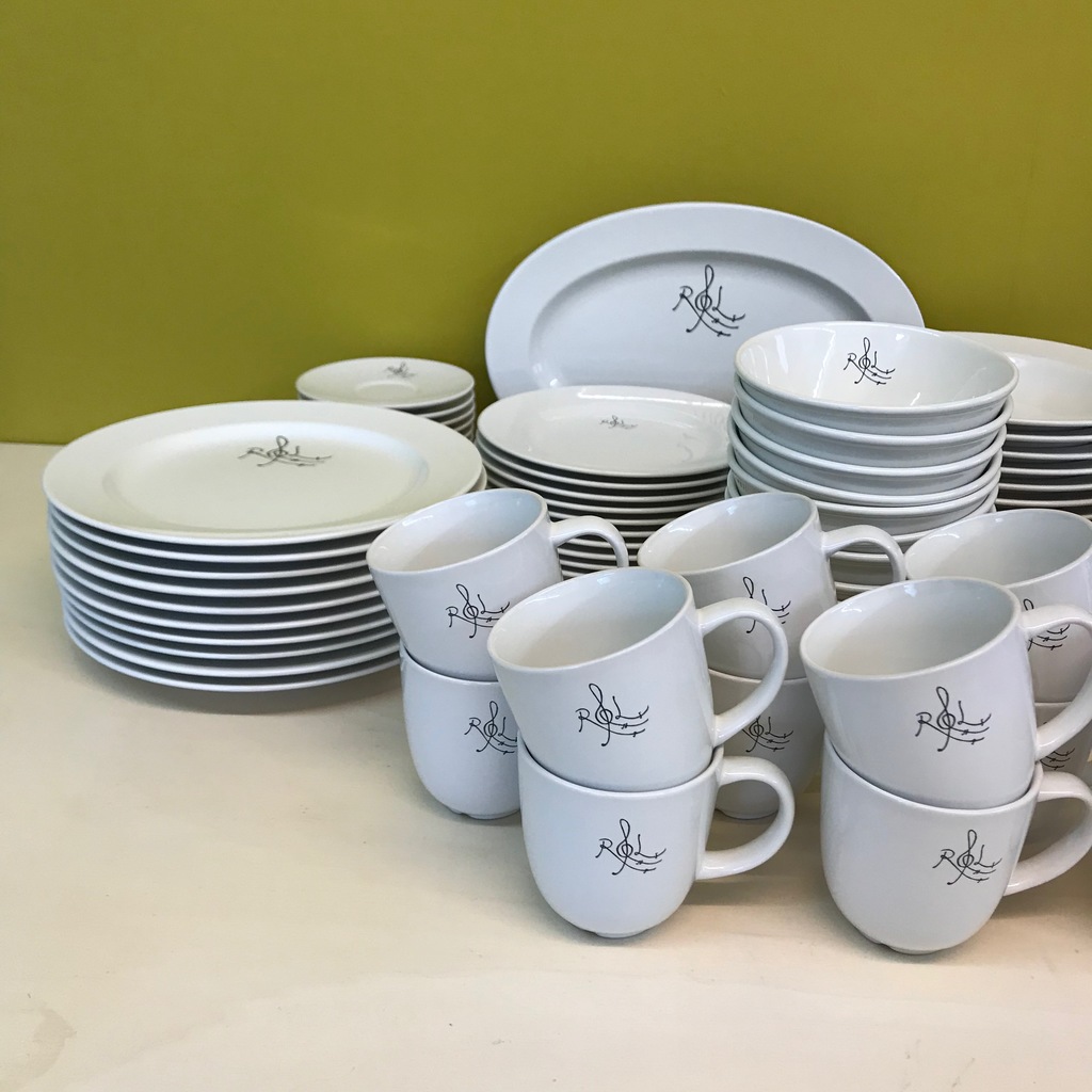 Servies met logo in opdracht gemaakt als huwelijkscadeau