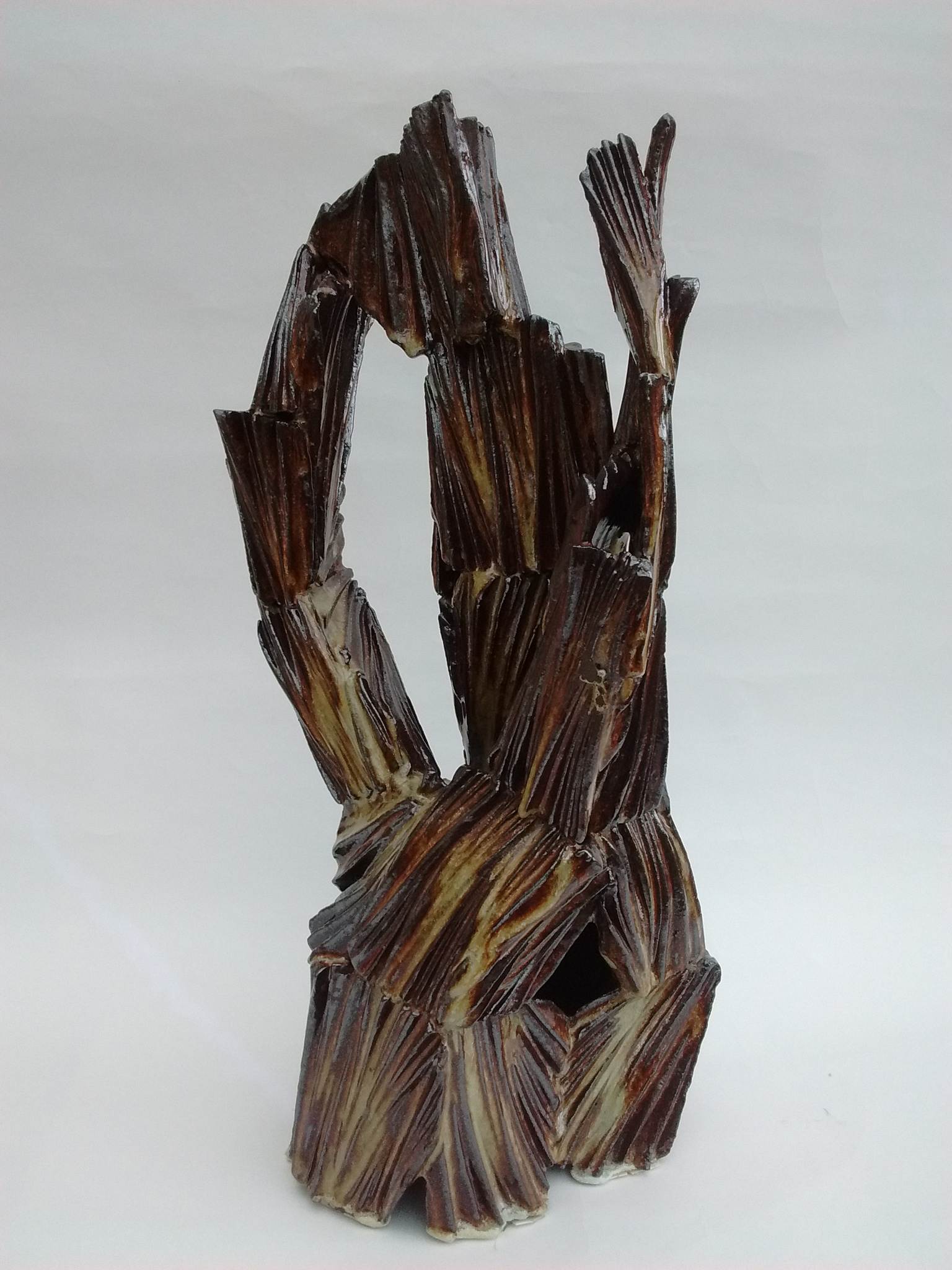 Zoektocht in keramiek: vrouwzijn in vloeiende lijnen en contouren; hoge dunne vaasvormen als weerspiegeling van een zoektocht naar identiteit...