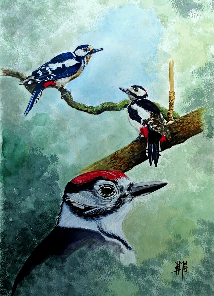 67x45cm aquarel . Illustratie van Grote Bonte Spechten , op koudgeperst katoenpapier.
