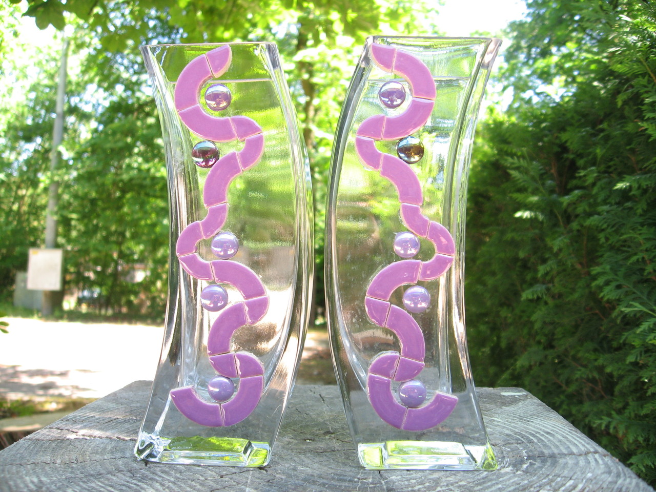 set van twee gebogen vaasjes met motief van hardgebakken paarse mozaïeksteentjes.