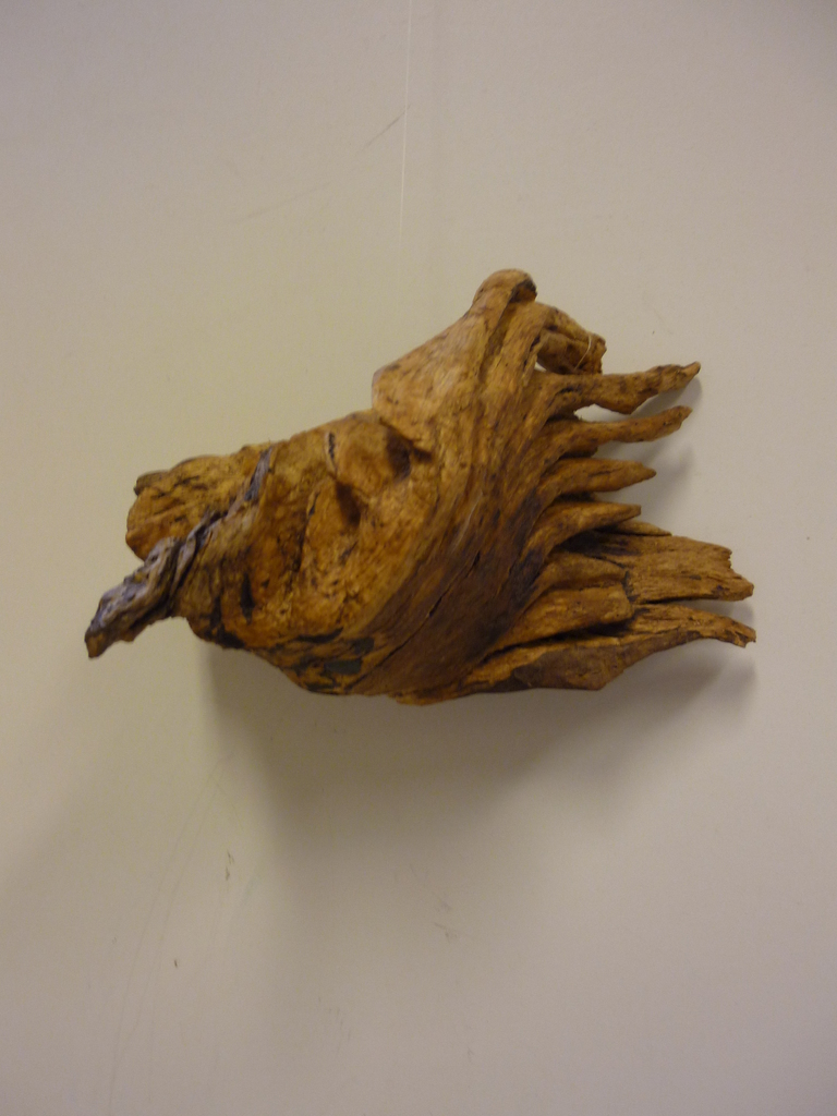 Vogel gemaakt van een natuurlijk halfvergaan stuk hout