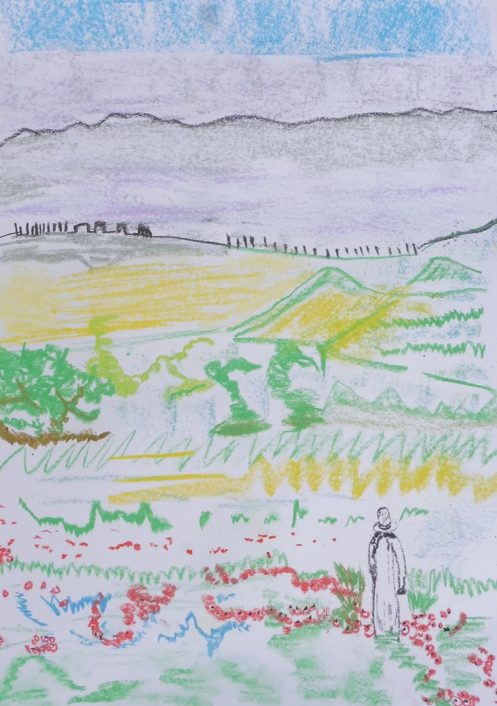 Perspectief Meanderen Meander Meandering Landschap Italië Toscany Toscane Landscape Pastel Drawing Tekening Grijs Blauw Geel Groen Zwart Rood Grey Blue Yellow Green Black Red Poppies