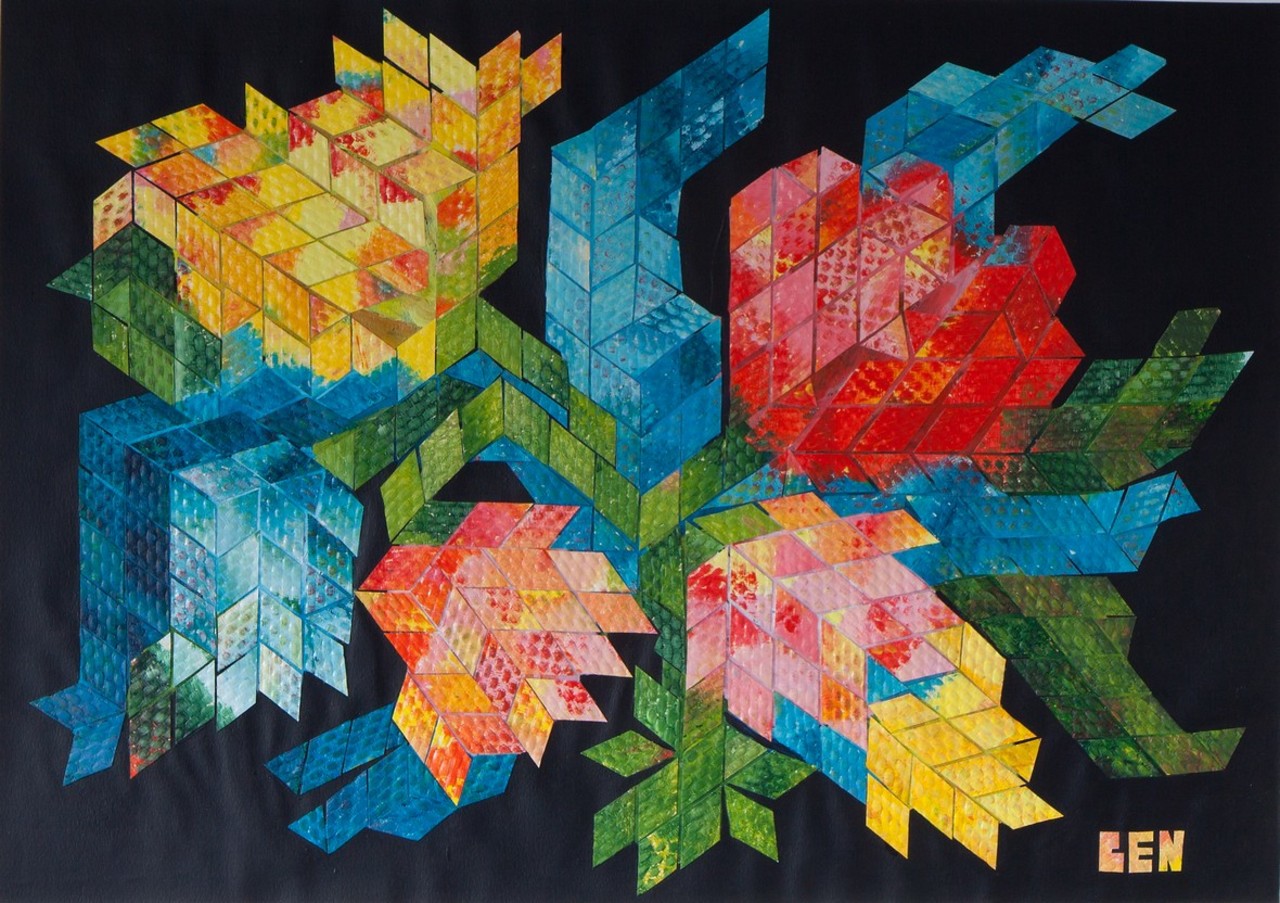 Getracht met stukjes behangpapier geïnspireerd door een op stof geborduurd bloemstukje een eigen nieuw bloemboeketje te maken. Inzending voor een wedstrijd van de Kantfabriek Horst. Helaas, alleen ik vond hem goed genoeg.