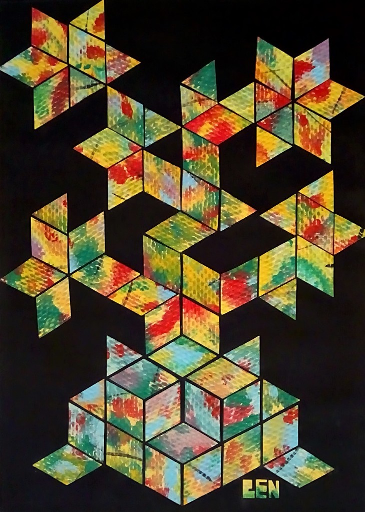 Hetzelfde onderwerp als Kant I. Als je er lang naar kijkt krijg je vierkante oogjes en ga je 3d kijken en begint de plant in de pot vanzelf te groeien.