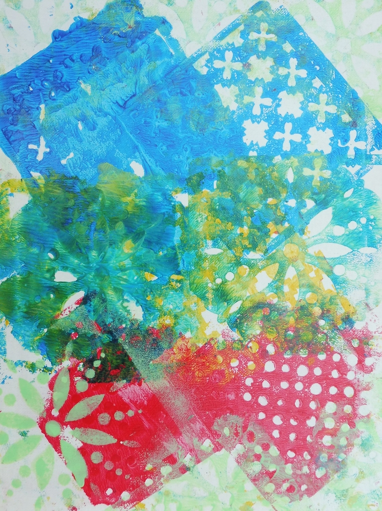 Druktechniek met sjablonen van licht naar donker en ook met verzadigde sjablonen...Sfeerimpressie