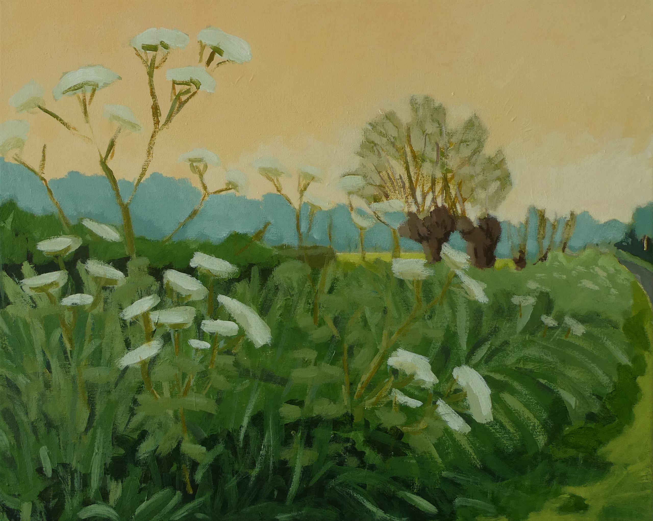 Schilderij Landschap Bloemen Licht Bomen Lente Stilte Avond Fleurs Avondlicht Peinture Printemps Paysage Fluitenkruid Grassen Berm Herbes Acrilique