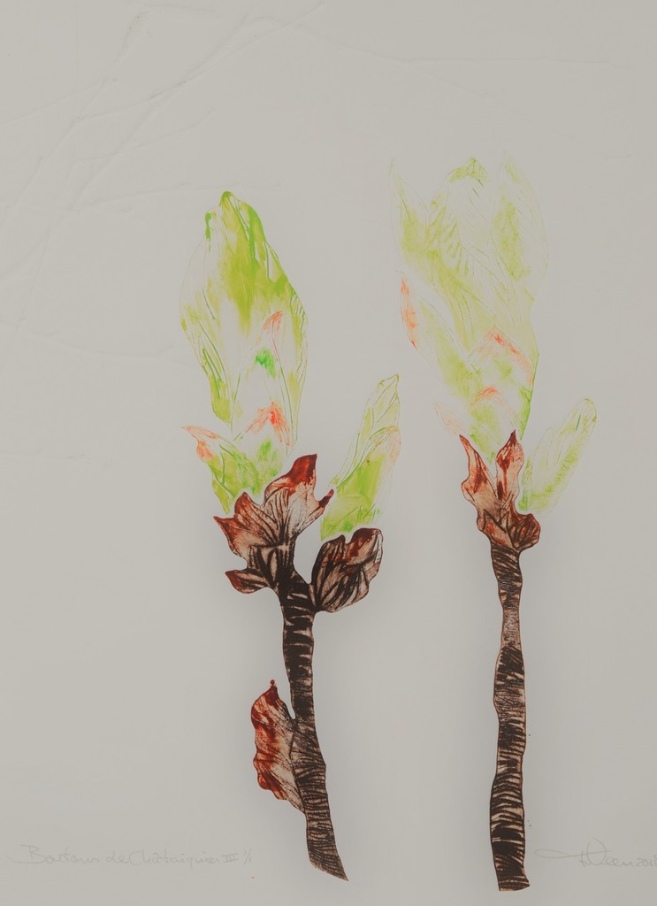 Kastanjeknoppen III - droge naald en aquatint - uitgezaagde zinkplaatjes - monotype - meerkleuren druk - oplage 1/1