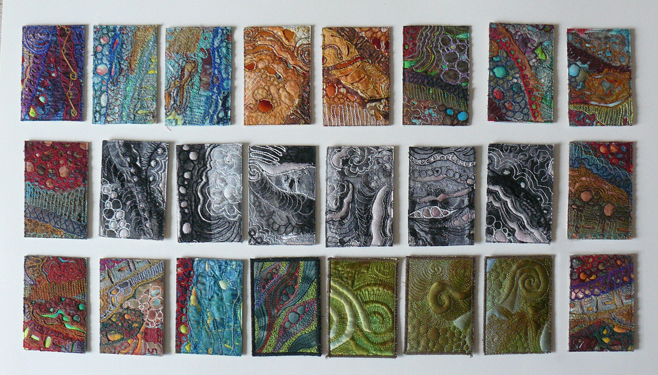 Kleine werkjes voor "Pakje Kunst Leiden" Geverfde stof, tyfec, organsaen vrij stikwerk