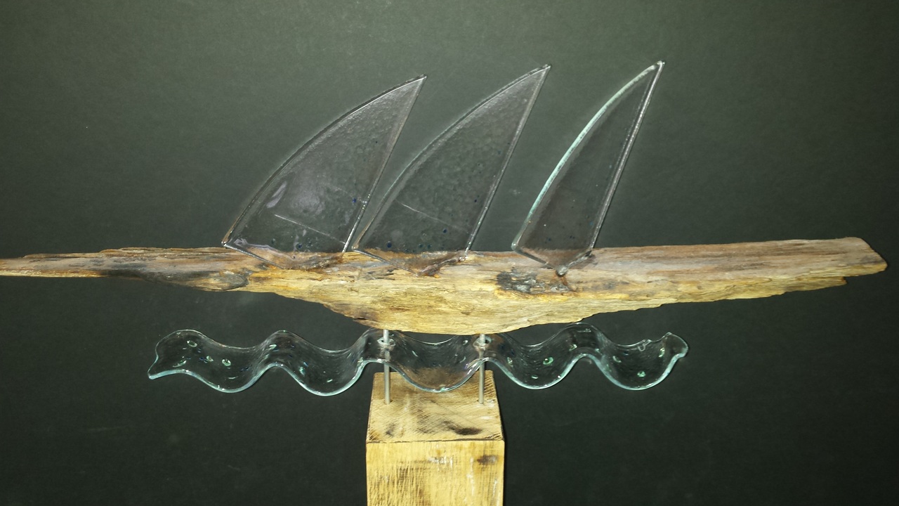 Gefused glazen zeiltjes op bootje van zwerfhout