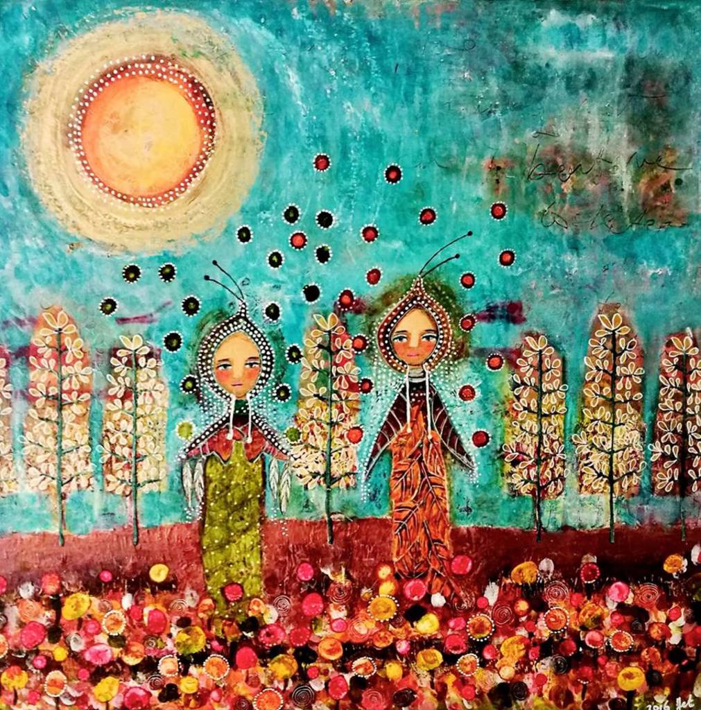 Mariette Bruinsma (1970) schildert onder de naam jetpaintingaway zowel met acrylverf als met olieverf. Ze heeft een intuitive aanpak, waarbij kleur en gelaagdheid belangrijk zijn. Haar thema's zijn: bomen, spiralen, bladeren en veren. Deze zie je overal in haar werk terug. Mariette geeft ook workshops. Kijk voor data op haar site: http://jetpaintingaway.nl