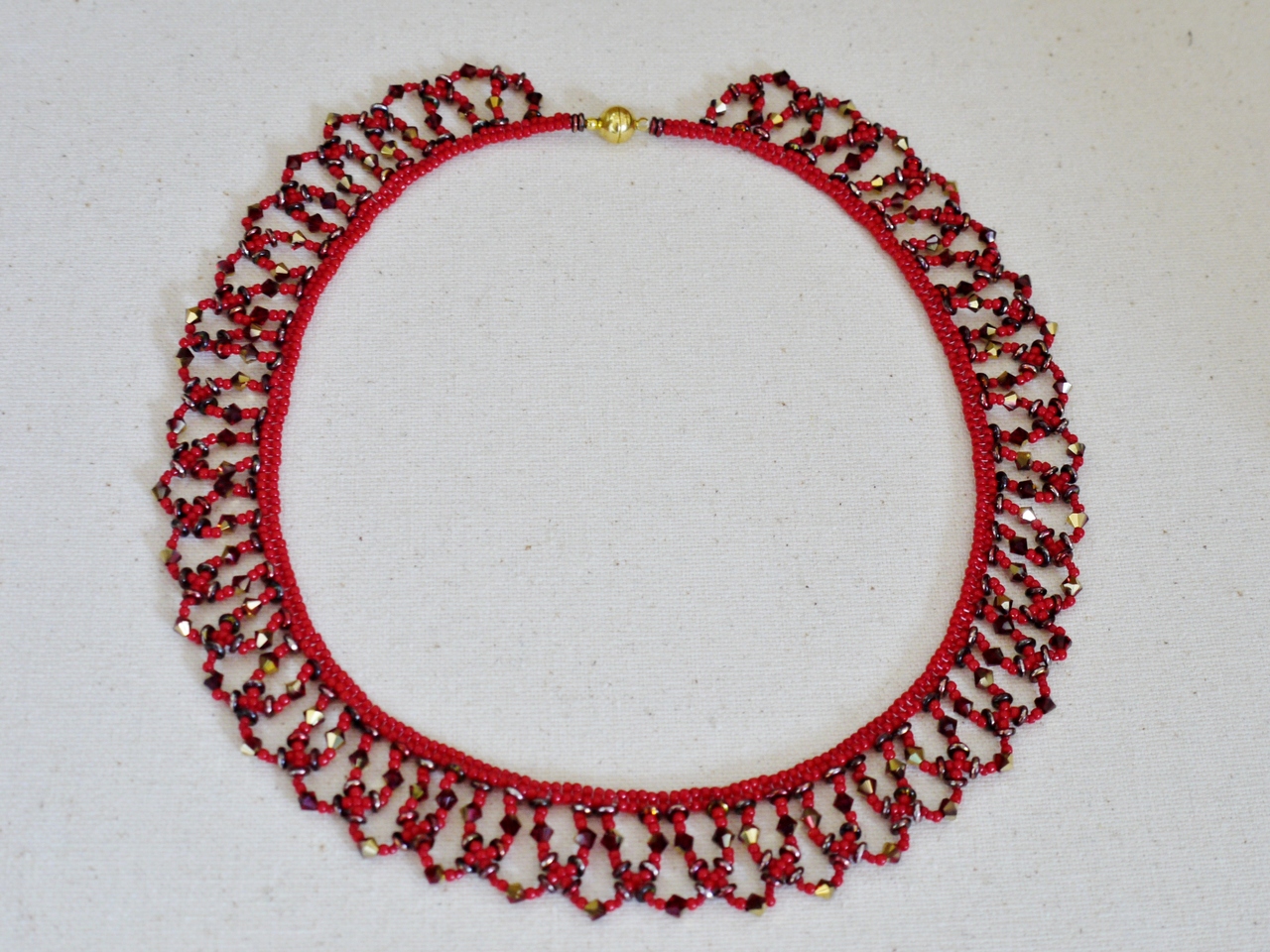 Rode geregen halsketting met oa. rood/goud kleurige facetkralen en magneetslotje. (niet geschikt voor mensen met een pacemaker!)