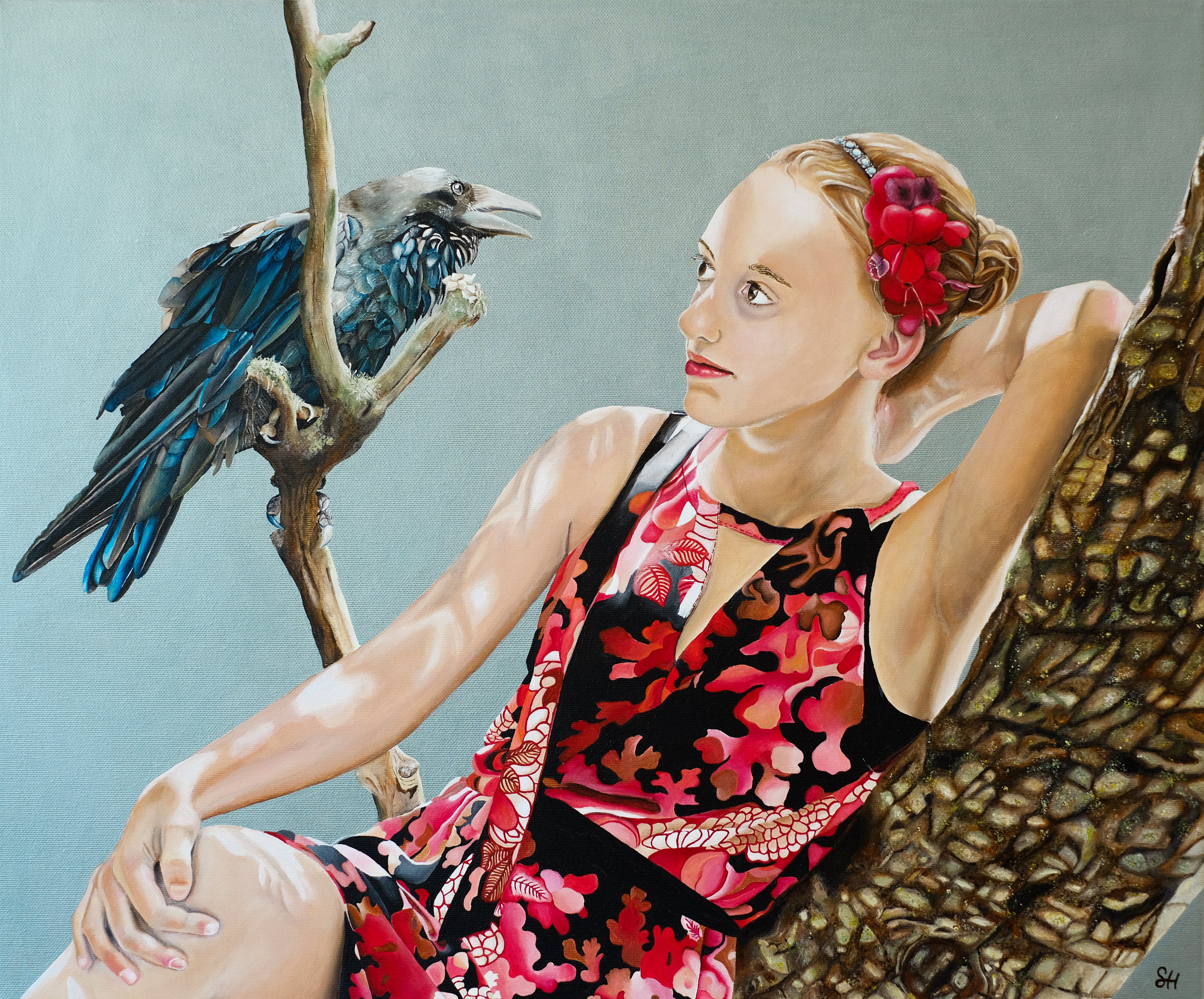 Portret van een meisje. Leunend in een boom lijkt zij te communiceren met een raaf. Levering met zwart houten baklijst. Levering/bekijken op afspraak.