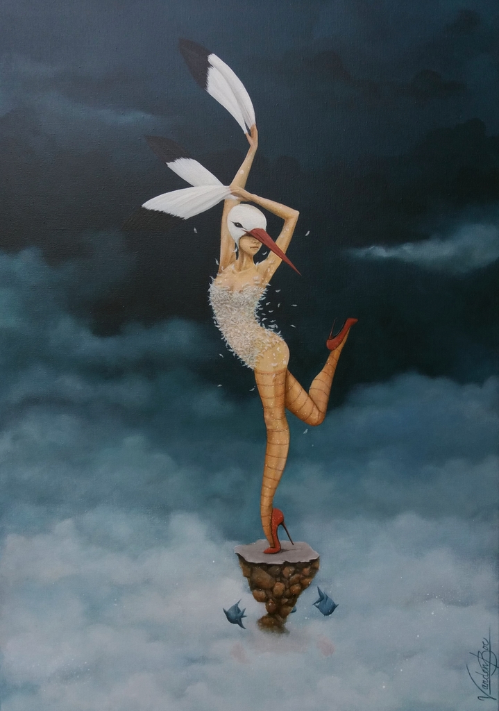 Sold Schilderij van een vogelvrouw (ooievaar) in de wolken. Een tikje uitdagend maar o zo onschuldig. afmeting: 100 x 70 cm