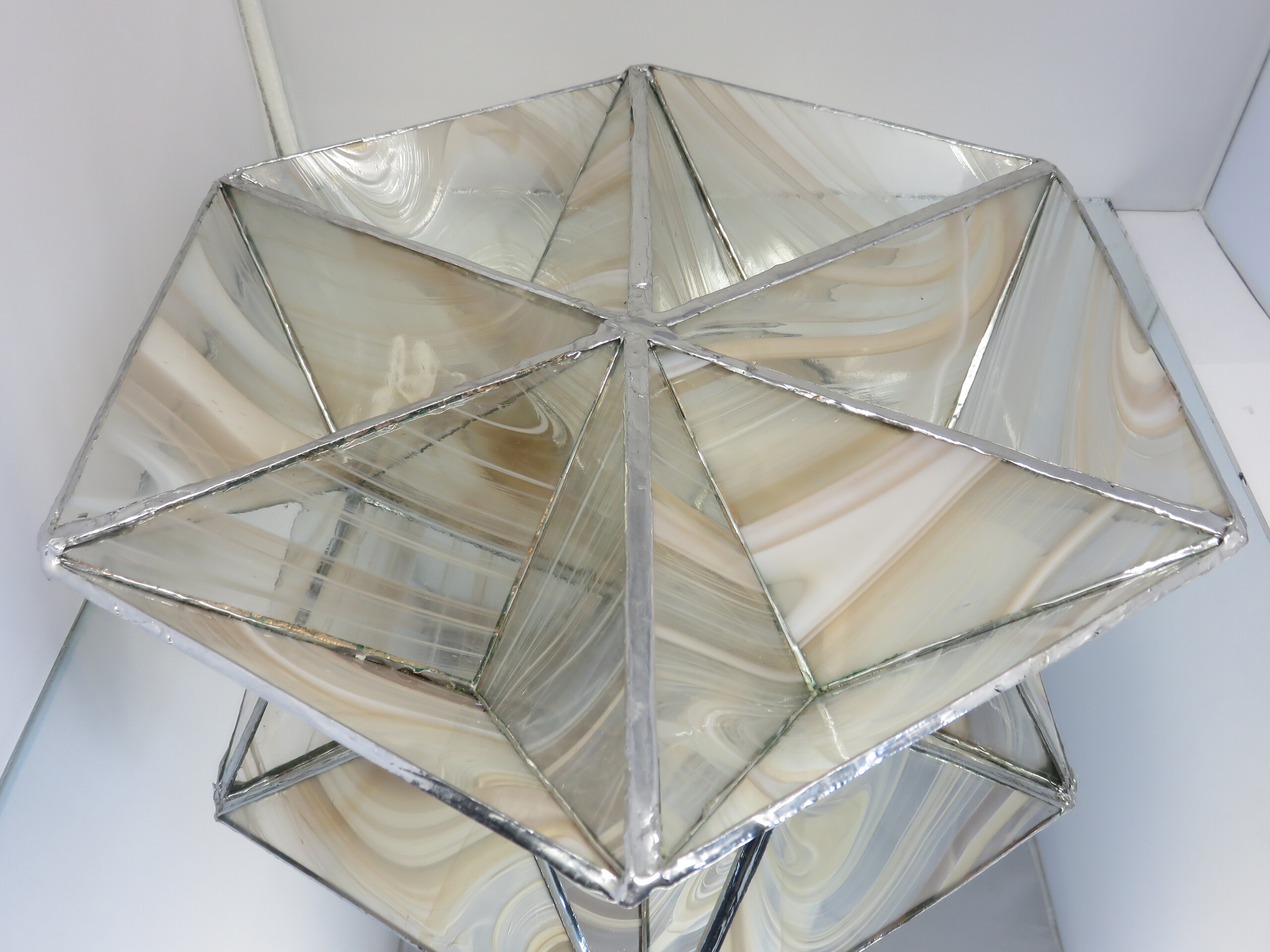 Schaal gemaakt met de tiffany techniek wit glas. Dit is een schaal met geometrische vormen.