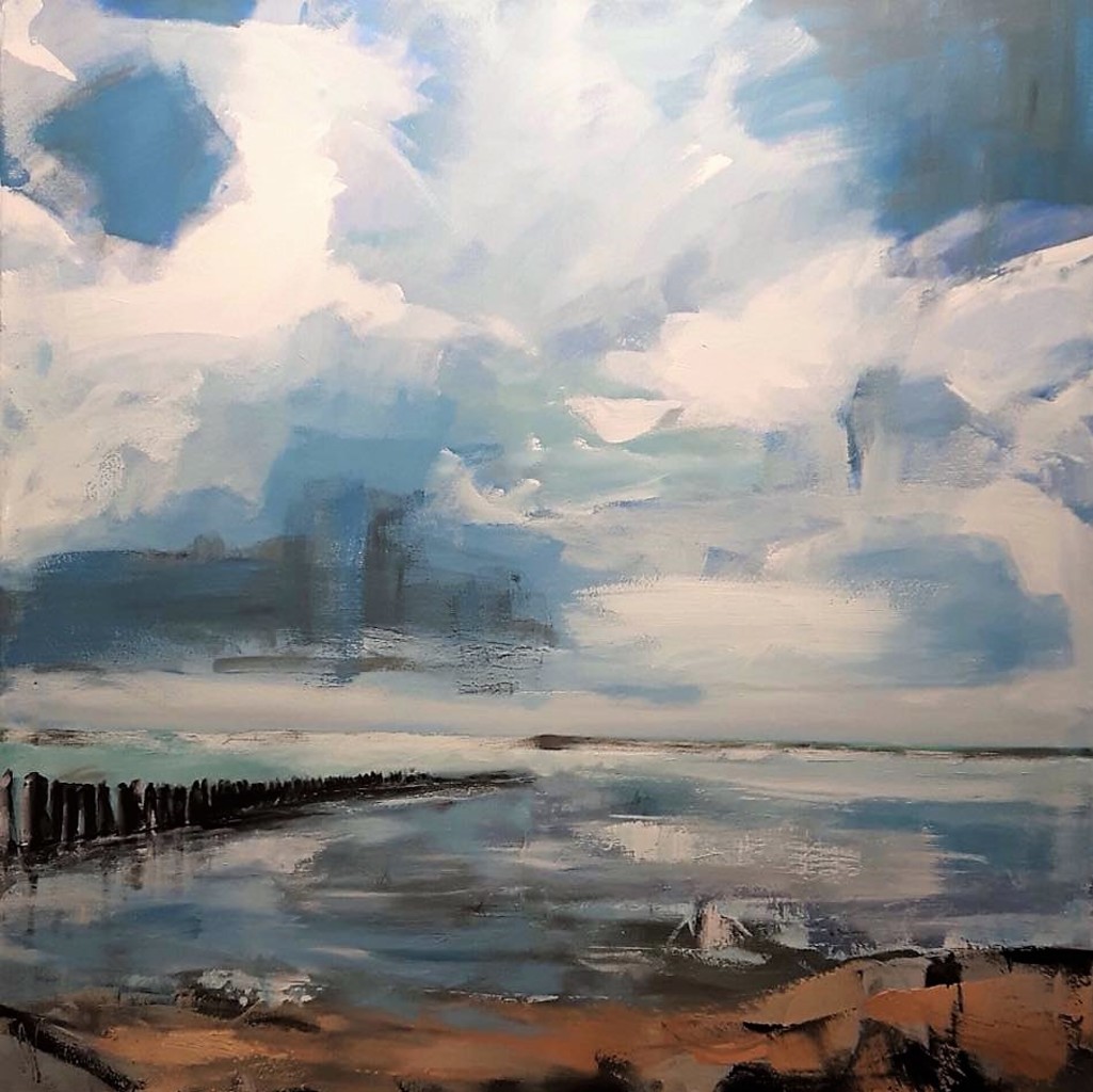 Wide, bold and big brushstrokes make this painting intriguing to look at! It captures the eye with the shadows in the foreground and draws it through the warm sands to the almost abstract sea break. The perspective created by the sea break takes you all the way back to the horizon. A `massive sky` full of interesting brushstrokes and details that shouldnt work....but just does, give this picture some brilliant light that is also reflected in the water near the shoreline. Cool greys and cool blues. Hard blues, petrol blue and titanium white.