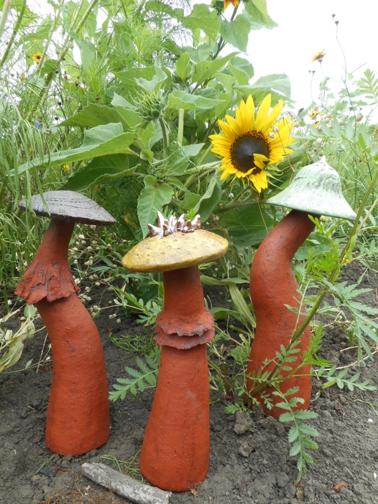 Paddenstoelen van rode klei. Met de hand opgebouwd en bewerkt met oxydes en glauur.