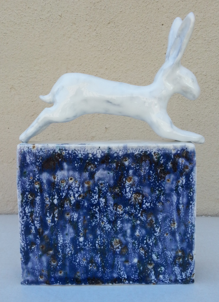 haas tijdens zijn sprong over het water van de beek. Porselein. Haas met wit glazuur. Het water blauw/groen gemengd glazuren