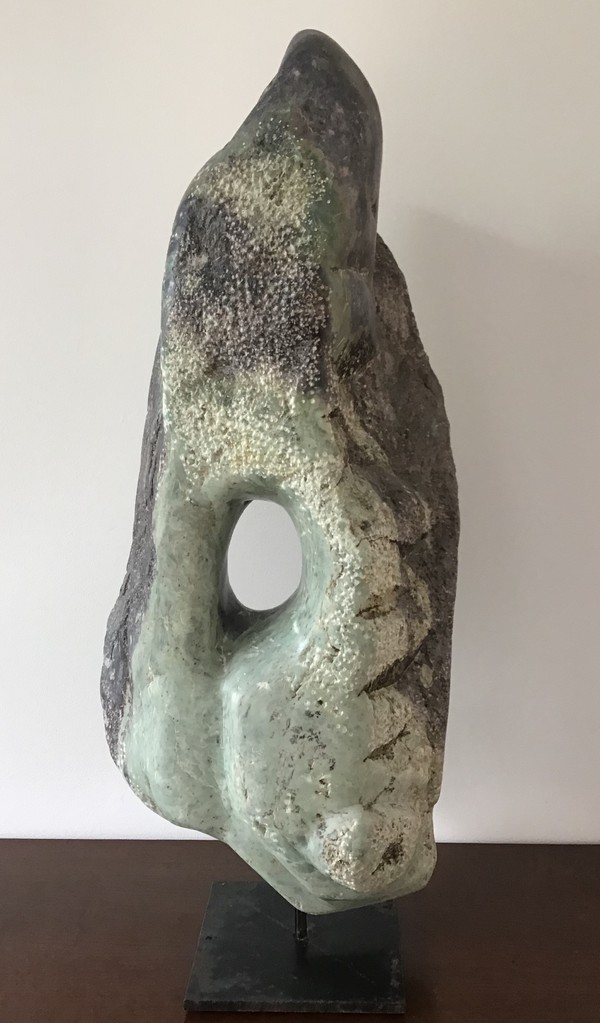 Steensoort is serpentijn. Plaatsing: buiten en binnen. Een mooie natuurlijke vorm en kleur in een jasje gegoten.Staat op een houten sokkel.