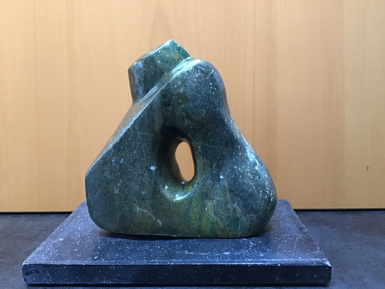 Steensoort: Verdite. Een exotische steen van hoge kwaliteit en ook moeilijk te bewerken. Plaatsing: binnen en buiten. Sokkel van hardsteen. De naam ontstond nadat deze steen werd meegebracht door medecursisten, als verrassing natuurlijk.