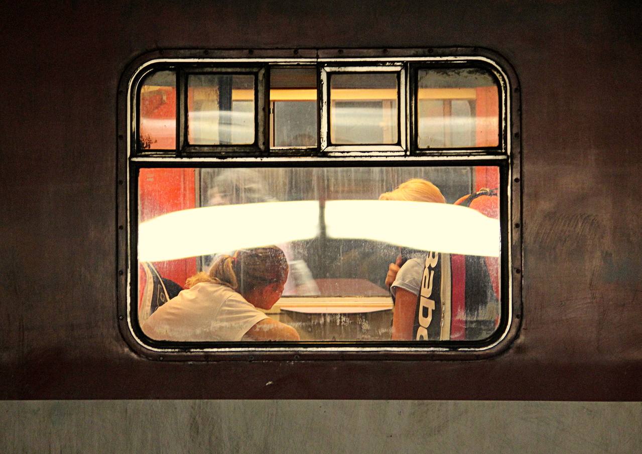 Mooie, bijna abstracte foto van een oud treinvenster met mensen, onherkenbaar, achter het raampje