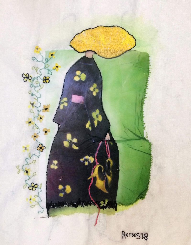 mixed media (transfer, borduur en verf)
