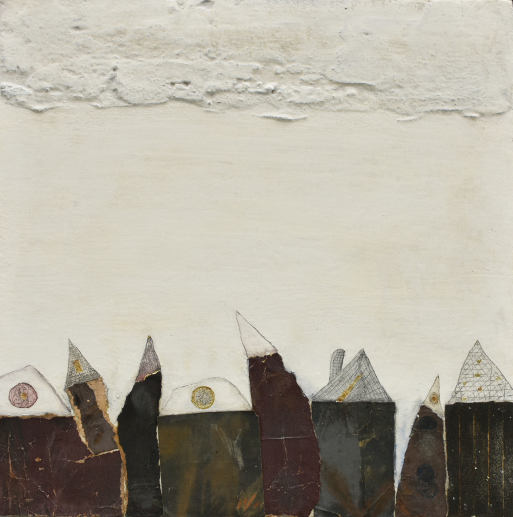 Gips, resten schuurpapier uit horlogemakers atelier, verguldsel, acryl. De huisjes geven "het leven" weer. Aantasting maar ook schoonheid...