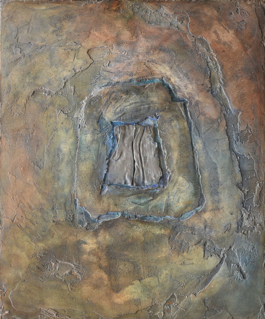 Elementen uit de aarde... Gips, zand, lood, acryl. Loden omlijsting.