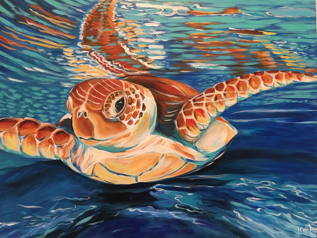 Blauw Acryl Painting Acrylverf Acrylic Bleu Sea Caribbean Zeeschildpad Turtle