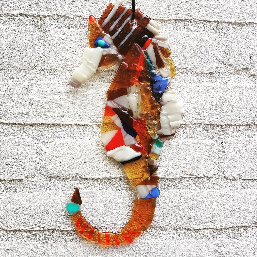 Zeepaardje van, gedeeltelijk gestapeld, gedeeltelijk plat gefused glas. Voor muur of raamdecoratie