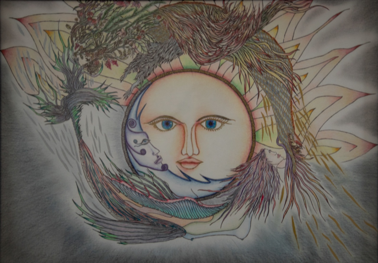 Boven de zon, die ook voor mannelijke energie staat, heb ik de groene man op fantasierijke wijze afgebeeld. Volgens sommige paganistische opvattingen is hij verantwoordelijk voor de bevruchting van de aarde. Onder de maan, die ook voor vrouwelijke energie staat, heb ik een zeemeermin met een eigenzinnige uitstraling afgebeeld. Gezien de maan mede verantwoordelijk is voor eb en vloed, staat zij en het water ook voor emotie en beweging.