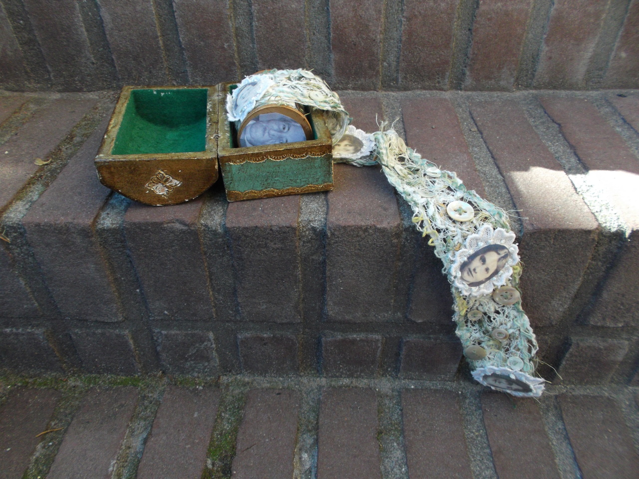 Op een antieke garenklos heb ik een boekrol gemaakt. De klos zit in een mooi doosje. Op de boekrol staan nostalgische damesfoto's afgedrukt op stof.