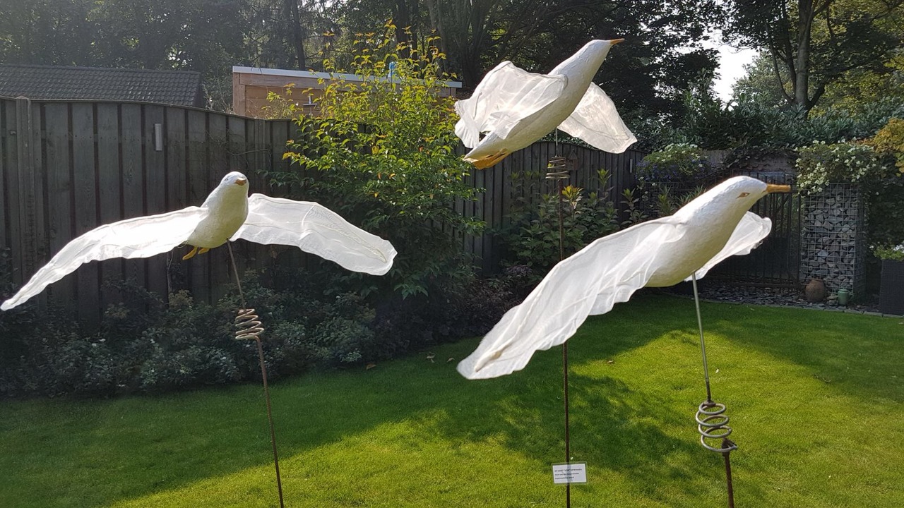 Met papier mache vogels gemaakt, met textiel en verf bewerkt.