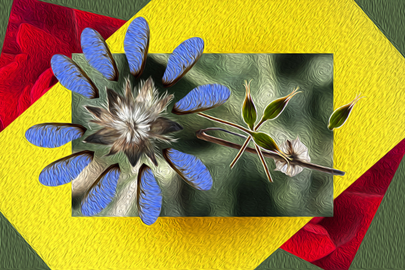 Fotobewerking, afgedrukt op canvas, rand 2 cm dik, omslag vervaagd. Uitgebloeid, opgedroogd, doodgegaan. Om plaats te maken voor nieuw leven. Later, in de lente. Elk jaar weer. Dat dooie spul is vaak prachtig. Collage begonnen in 2010, afgerond in 2016.