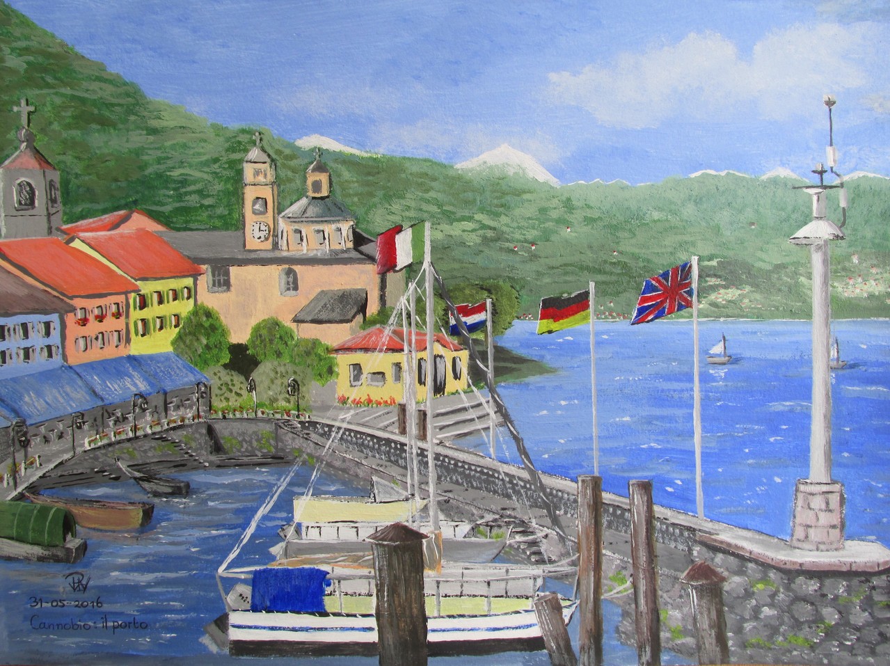 Canobbio; il Porto (haven) Het schilderij is inclusief passe partout en lijst 40 cm. x 50 cm.