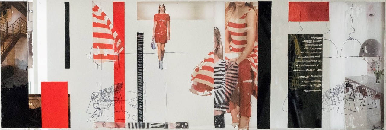 Gemengde techniek op plexiglas, 2 lagen, doorzichtig, 2 zijdig verdiept ingelijst zodat er door het werk heen gekeken kan worden. Het werk kan losstaand in het interieur staan zodat je eigen interieur ook meedoet in het werk.