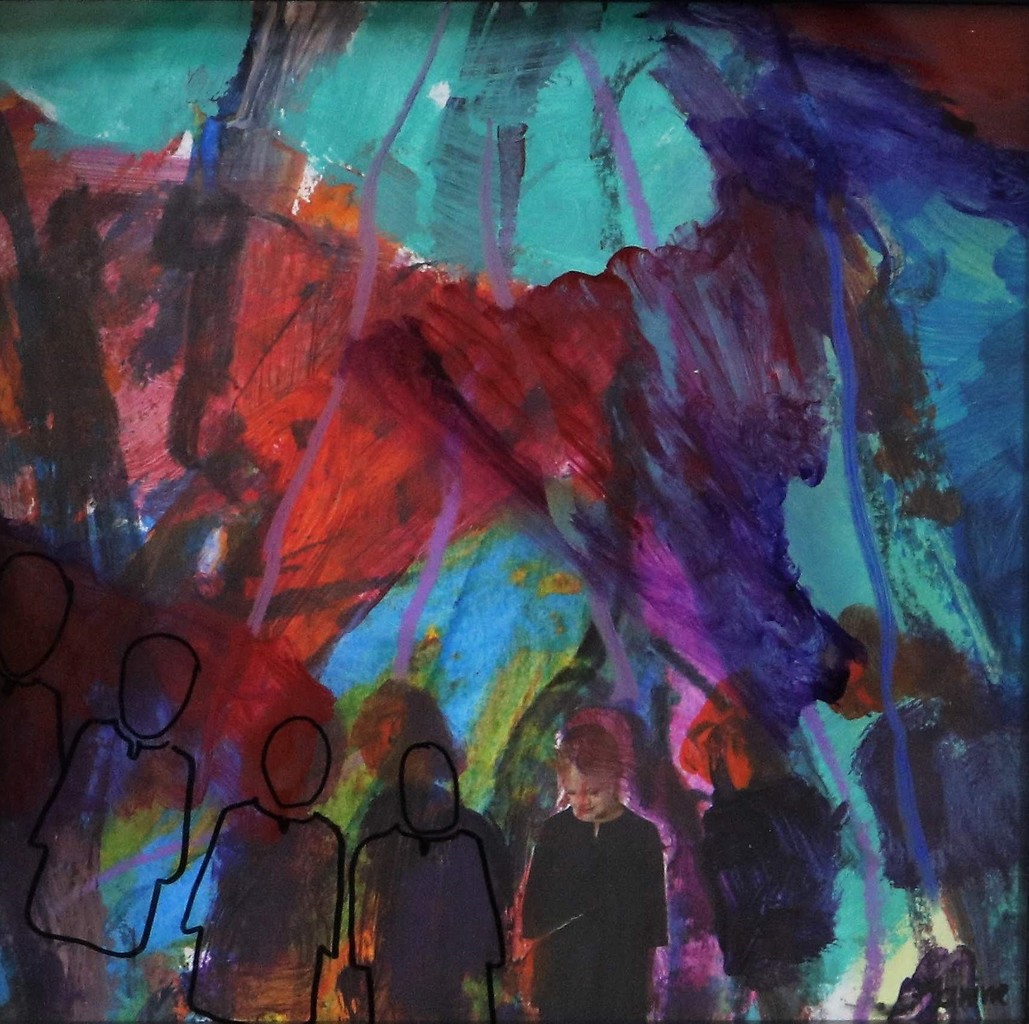 Een kleurig werk op de achtergrond is de basis voor een minimalitische tekening op de voorgrond op plexiglas. Gezamelijk 3D ingelijst.