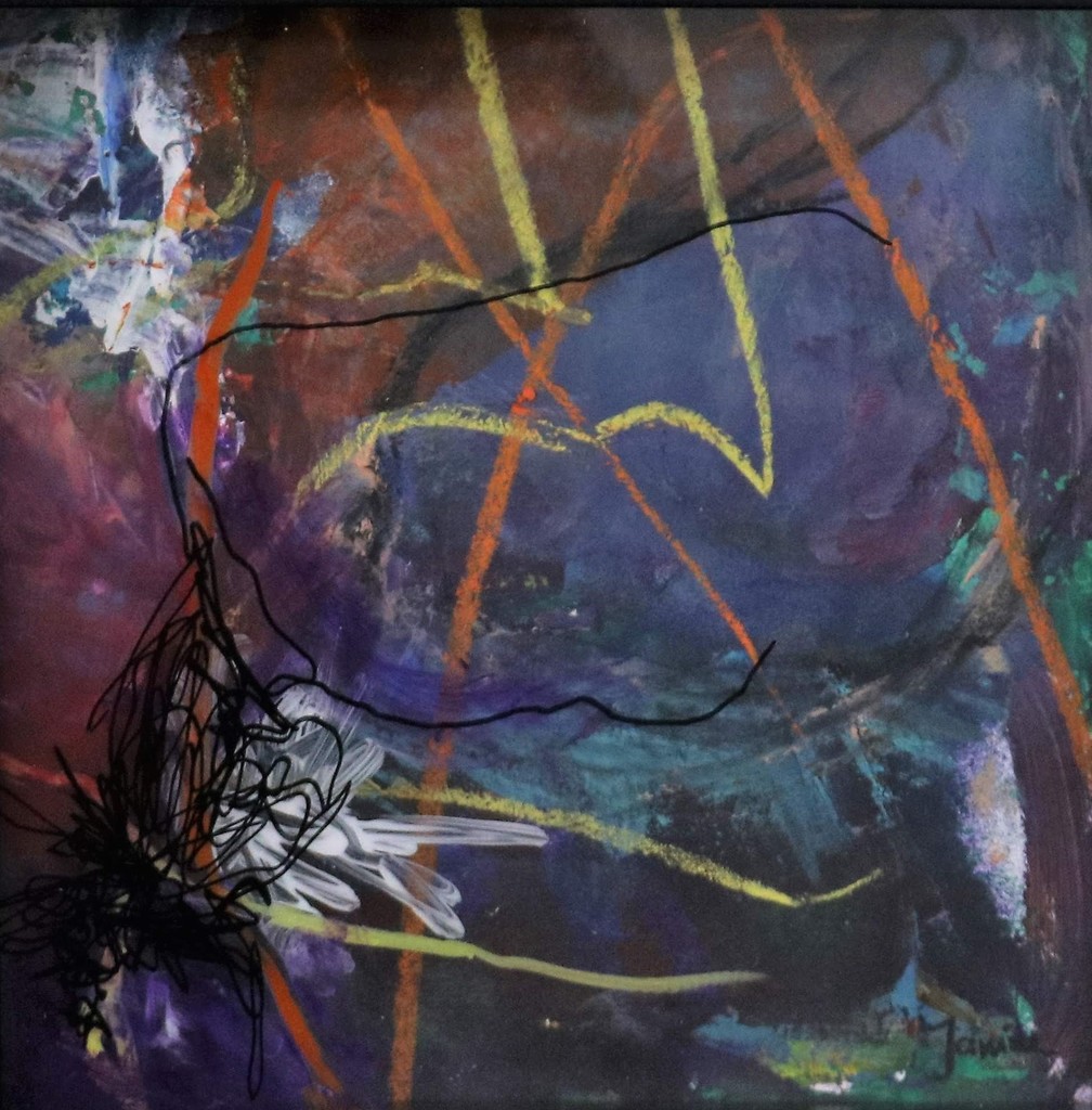 Een kleurig werk op de achtergrond is de basis voor een minimalitische tekening op de voorgrond op plexiglas. Gezamelijk 3D ingelijst.