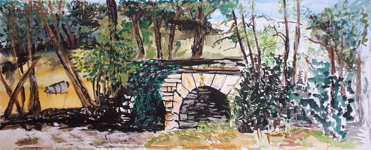 panorama naar de waarneming van een Frans landschap; een brug over de Seine, een wei, struiken, bomen.5/8/2018