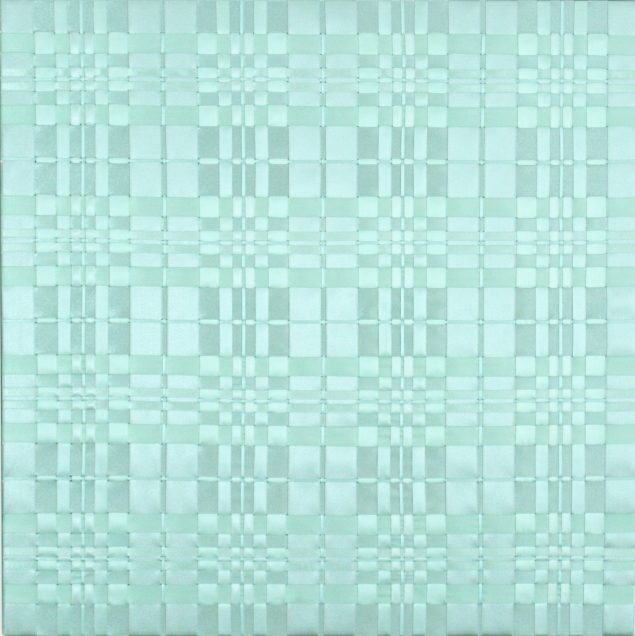 Vlechtwerk gemaakt met turquoise satijnlint dat op een houten frame gespannen is. Door met verschillende breedtes te werken ontstaat de illusie van 3D rondingen terwijl het een plat vlak is. Ook lijken het twee kleuren te zijn, maar er is maar een kleur lint gebruikt. De lichtval zorgt voor het verschil.