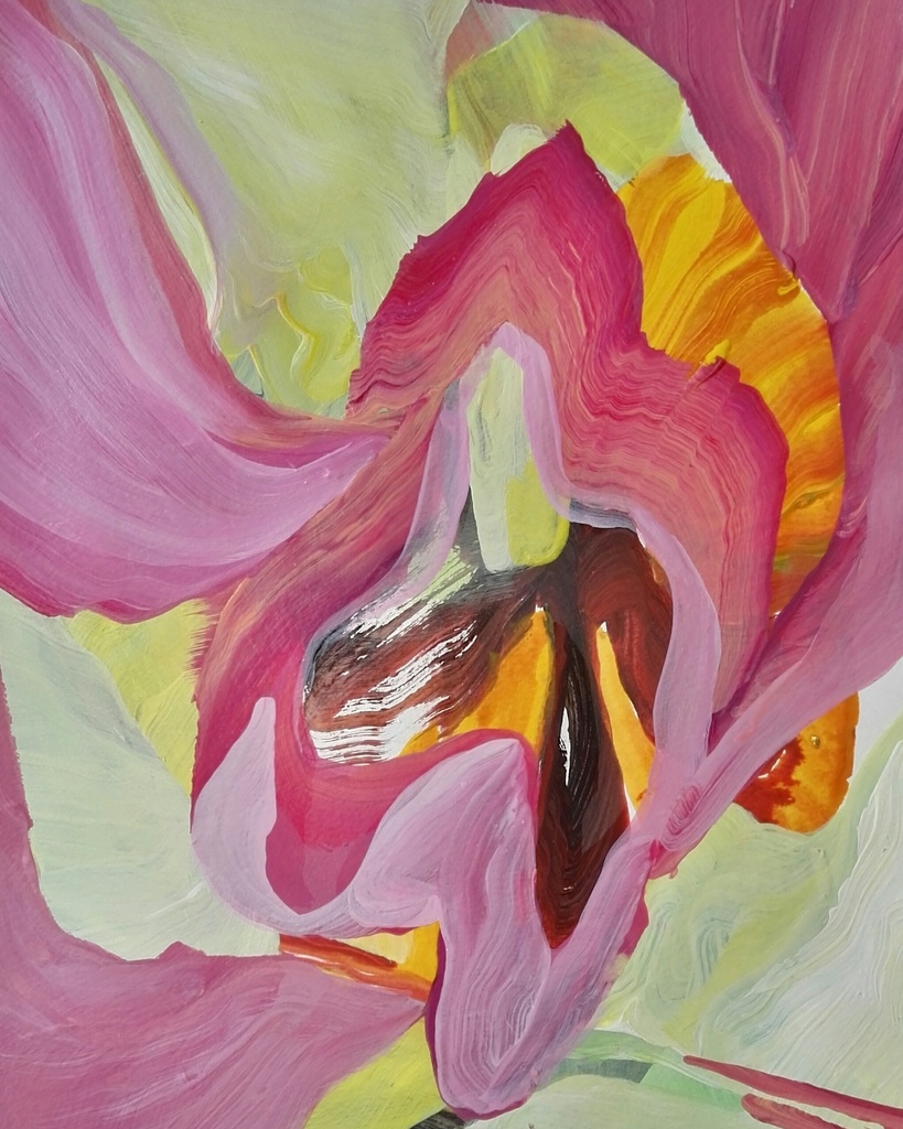 Het is mijn manier van kijken naar de dingen....De bewegingen die ik maak in de verf.... De beelden zijn sensueel en met een erotische associatie. Dit is niet voor iedereen waarneembaar. Mijn inspiratie vind ik in het binnenste van bloemen ( insideofaflower) , in schelpen en vruchten... Door in te zoomen op de kwaststreken van eerdere werken ontstaan er nieuwe beelden. Losse vormen die een eigen leven gaan leiden. Ze lijken heel vleselijk en lichamelijk. Ik houd zoveel van verf dat ik verzamelingen aanleg van losse kwaststreken en vlekken op een transparante ondergrond. Zo ben ik steeds op zoek naar vernieuwing in mijn werk. Naast tekenen en schilderen maak ik ook collages en kleine objecten. ZIE ook instagram : inekedimphiclaessens