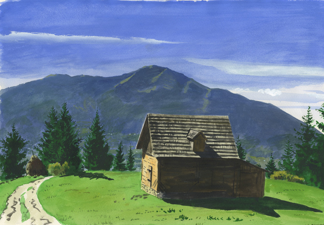 Schilderij Figuratief Landschap Groen Art Aquarel Kunst Bergen Painting Green Landscape Realism Figurative Watercolor Mountains Watercolour Roemenië Romania