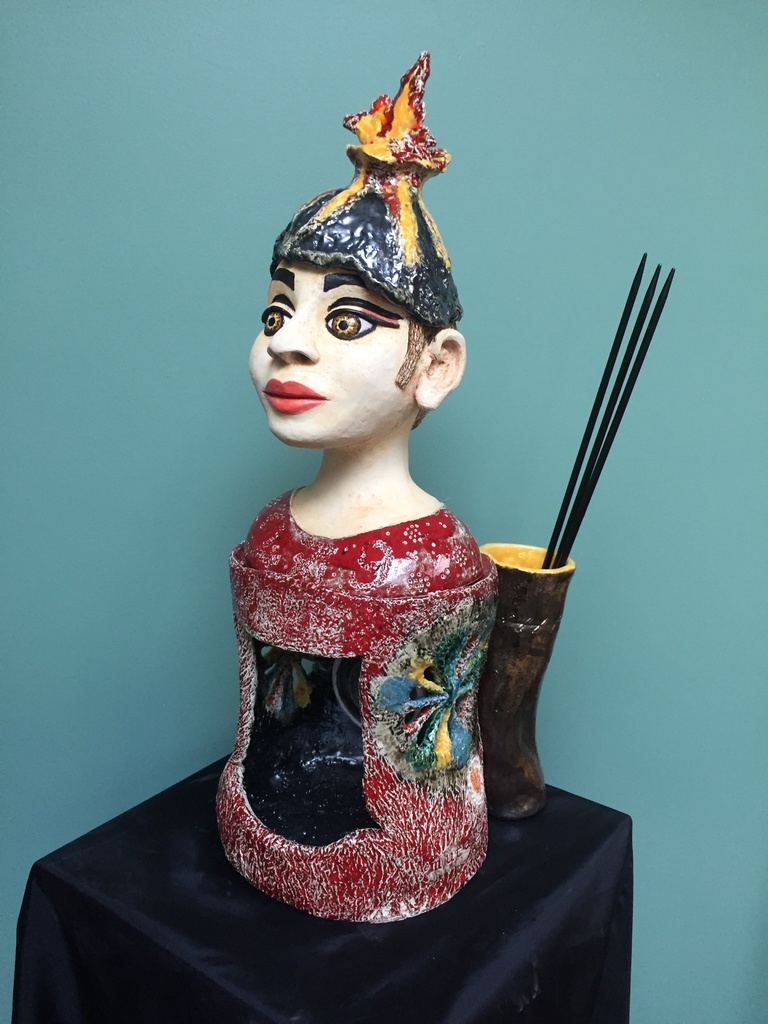 Cecile maakt keramische beelden, potten, dozen en tegels en geluksvisjes. Koppen met hoofdtooi of badmuts. Sprookjesachtig en kleurrijk geglazuurd. Cecile ter Borgh is lid van de SKNH en heeft werk in stock bij Galerie Stam in Amsterdam.