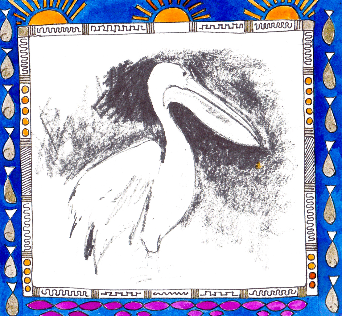 pelikaan geschetst in houtskool met randversiering in gekleurde inkt ingelijst in aluminium lijst met formaat 29 x 36 cm met ecru passe-partout