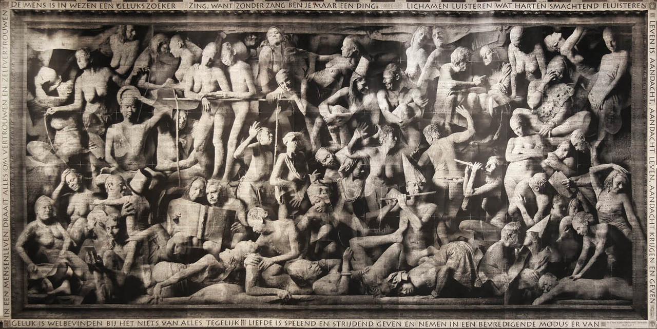 Eerste paneel van Ecce Homo. De modellen, bedekt met leem, zijn apart gefotografeerd waarna het totale beeld werd samengesteld en geprint op in totaal 400 bladzijden papier van een oud katholiek misboek. Het totale vierluik is ruim 10 m lang. Teksten: Harrie Sevriens (+2018).