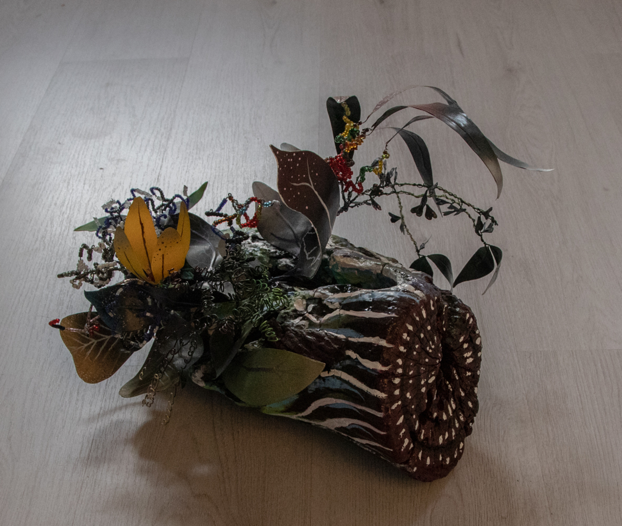 Langs de rivier lag half verscholen in het zand een verdroogde stronk. Na deze goed schoongeborsteld te hebben, ben ik het op een creatieve manier gaan verven en decoreren met ijzerdraad, kralen en papier. Het idee van de stralende gele bloem is ontstaan door het zonnige weer. Tijdens de vondst van deze stronk was de zon prominent aanwezig.