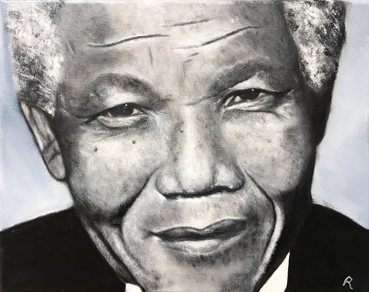 Nelson Mandela *Dit schilderij is met olieverf en penseel opgebracht. *De zijkanten zijn meegeschilderd. * Vernislaag is aangebracht mat/glans. *De canvas heeft een hout frame met spies opgespannen. *Het schilderij is gesigneerd op de achterkant met de eerste letters van mijn voor en achternaam (RP) Renate Peters en met de datum dat het schilderij is gecreëerd. Aan de voorkant is er de letter R (van Renate) te vinden rechts onderin.