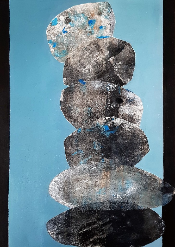 Grijs Zwart Blauw Papier Gemengde Techniek Olieverf Op In En Monoprint Etsinkt Cairn Steenstapel